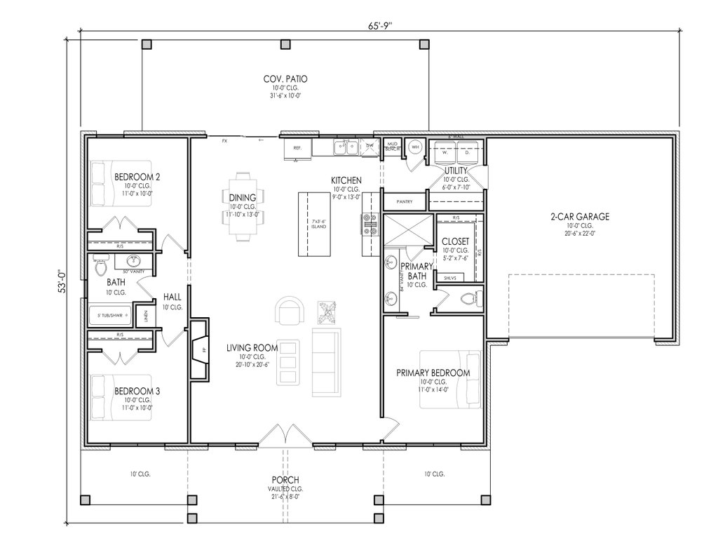 - Foundation Plan: This page shows all necessary notations and dimensions including support columns, walls, and excavated/unexcavated areas.