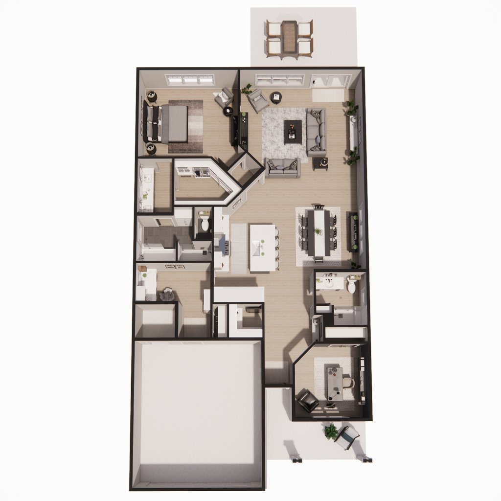 - Overhead Roof Plan(s): A view of the home from above showing roof pitch, peaks, valleys, and other details.