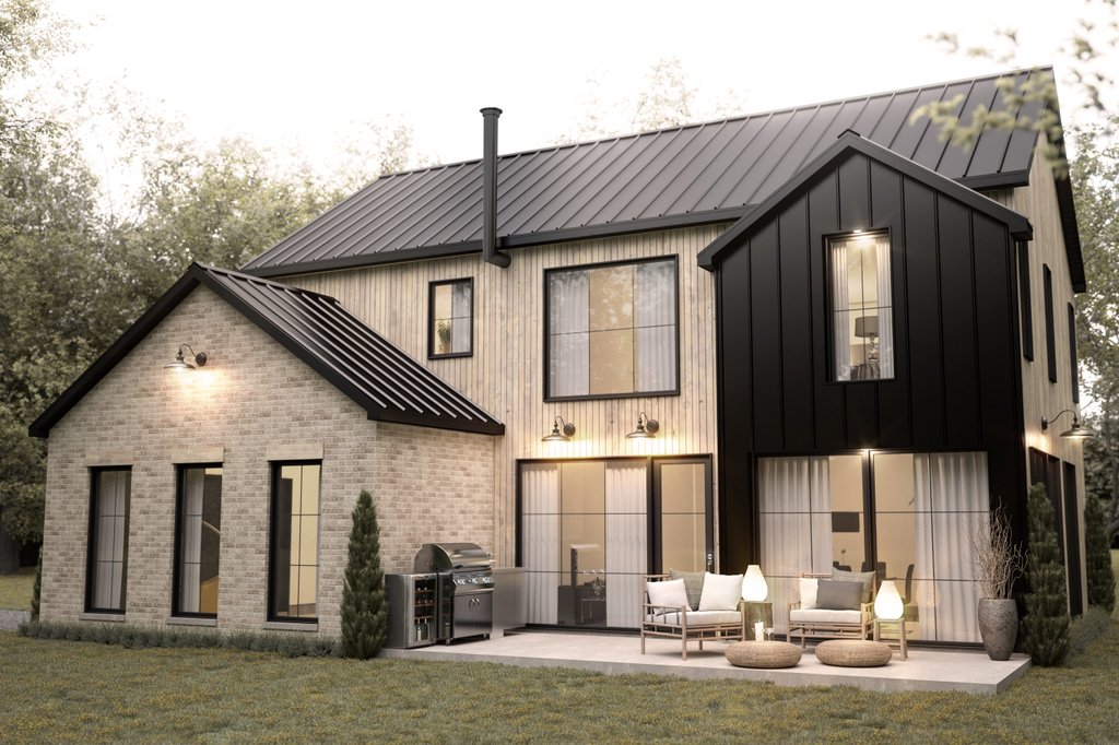 - Exterior Elevations: Front, rear, left & right sides) typically include: Floor/ceiling heights, dimensions of standard windows & roof overhangs, location of all needed flashings, height and location of foundation, type of finishing and textures, dimensions of chimney,