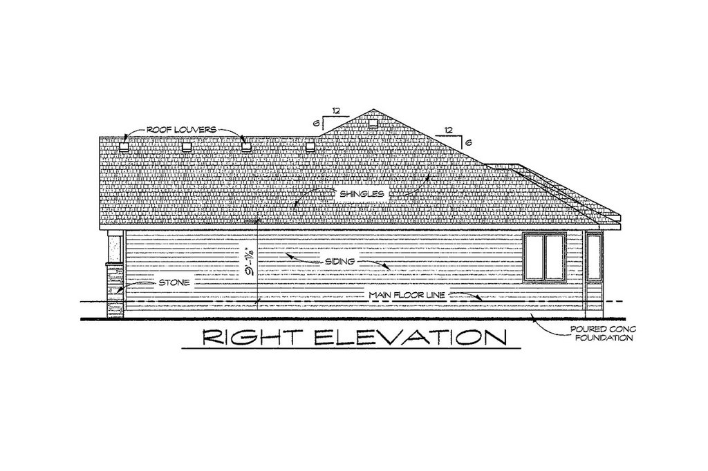 - Exterior Elevations: Drafted at 1/4" scale for the front and 1/8" scale for the rear and sides. All elevations are noted and an aerial view of the roof is provided, showing all hips, valleys and ridges.