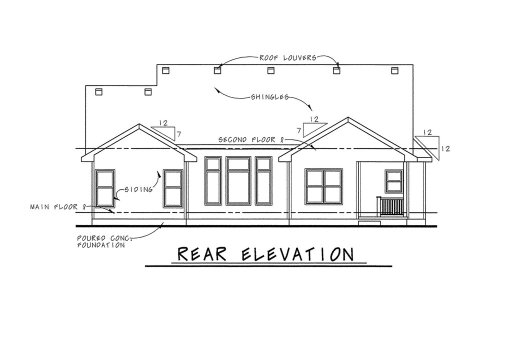 - Exterior Elevations: Drafted at 1/4" scale for the front and 1/8" scale for the rear and sides. All elevations are noted and an aerial view of the roof is provided, showing all hips, valleys and ridges.