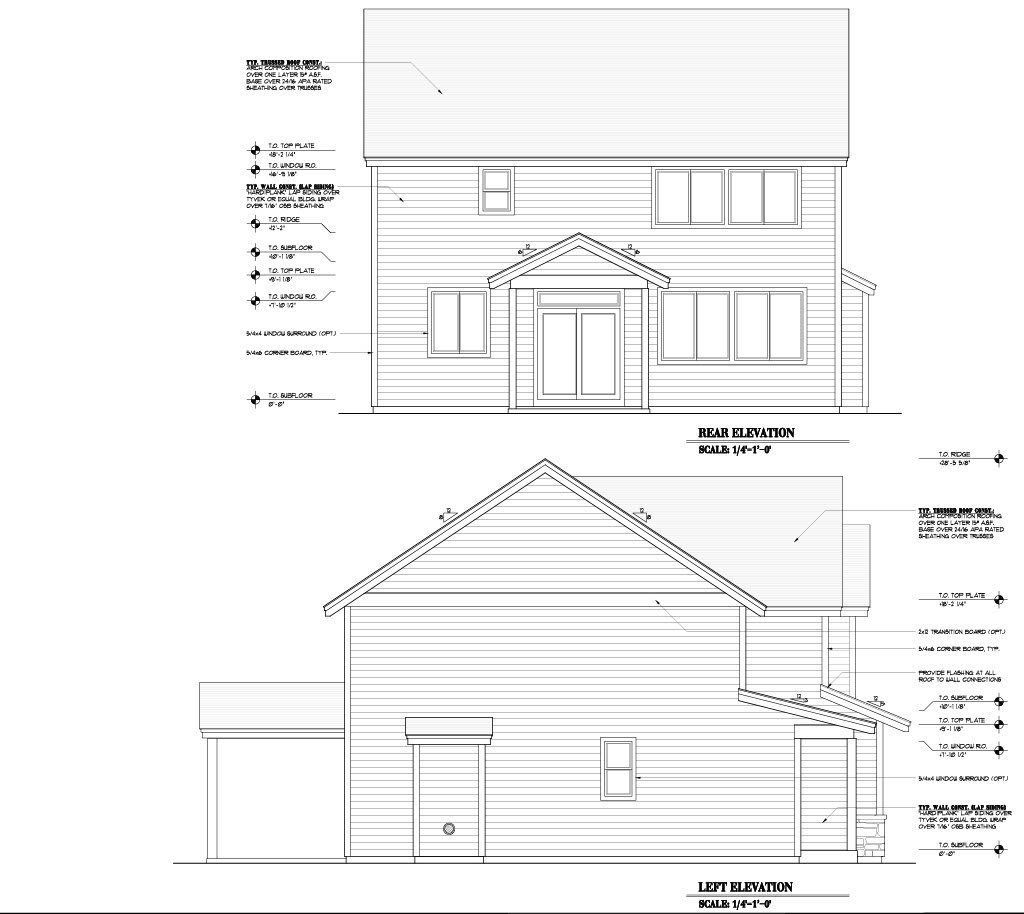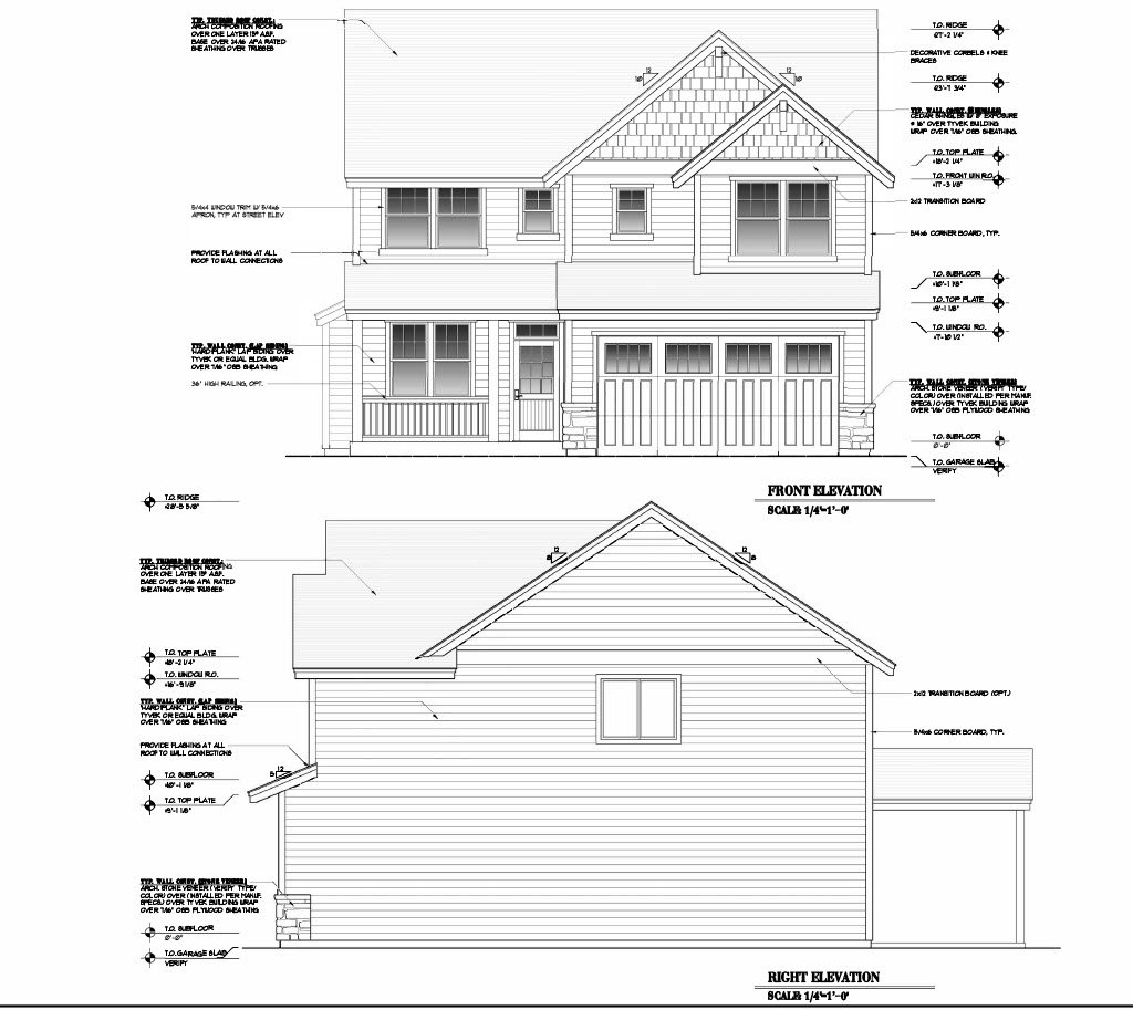 - Exterior Elevations: A blueprint picture of all four sides showing exterior materials and measurements.
