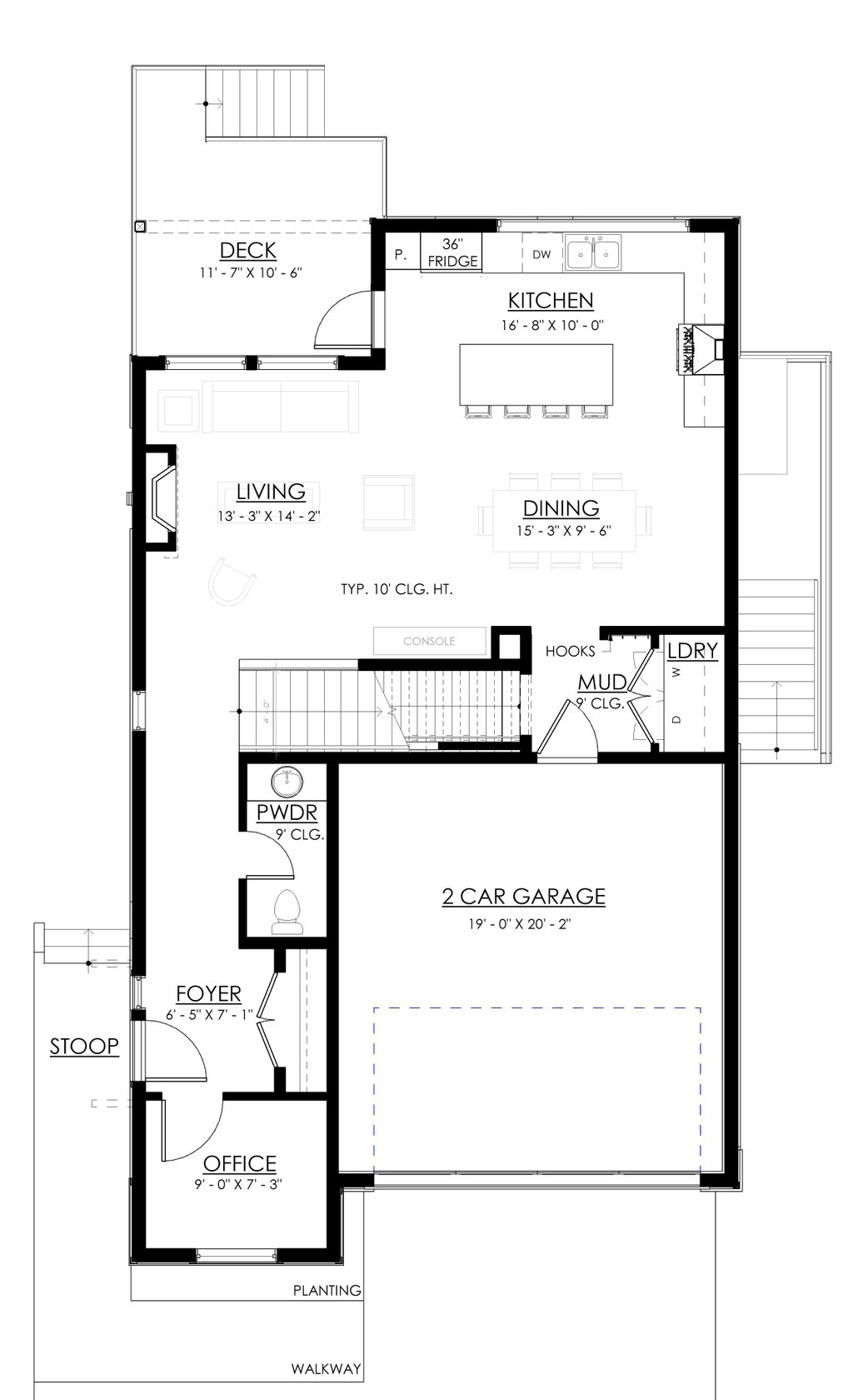 - Roof Plan: Roof framing sizes/layout, roof pitch, attic venting, overhangs, roof finish materials, etc.