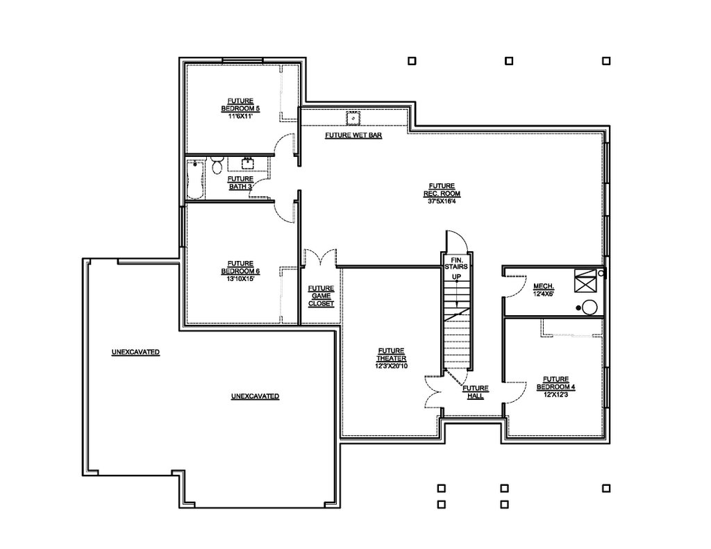 - Foundation Plan: This page shows all necessary notations and dimensions including support columns, walls, and excavated/unexcavated areas.