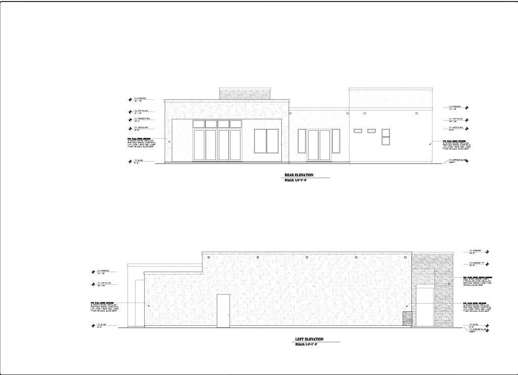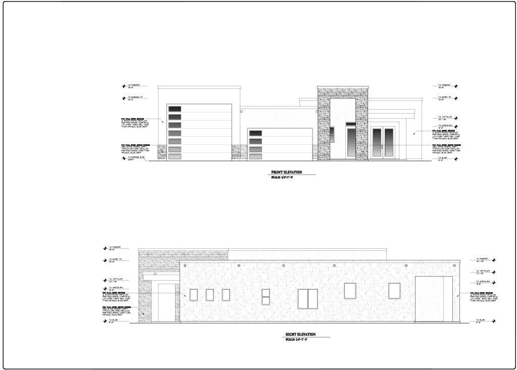 - Exterior Elevations: A blueprint picture of all four sides showing exterior materials and measurements.