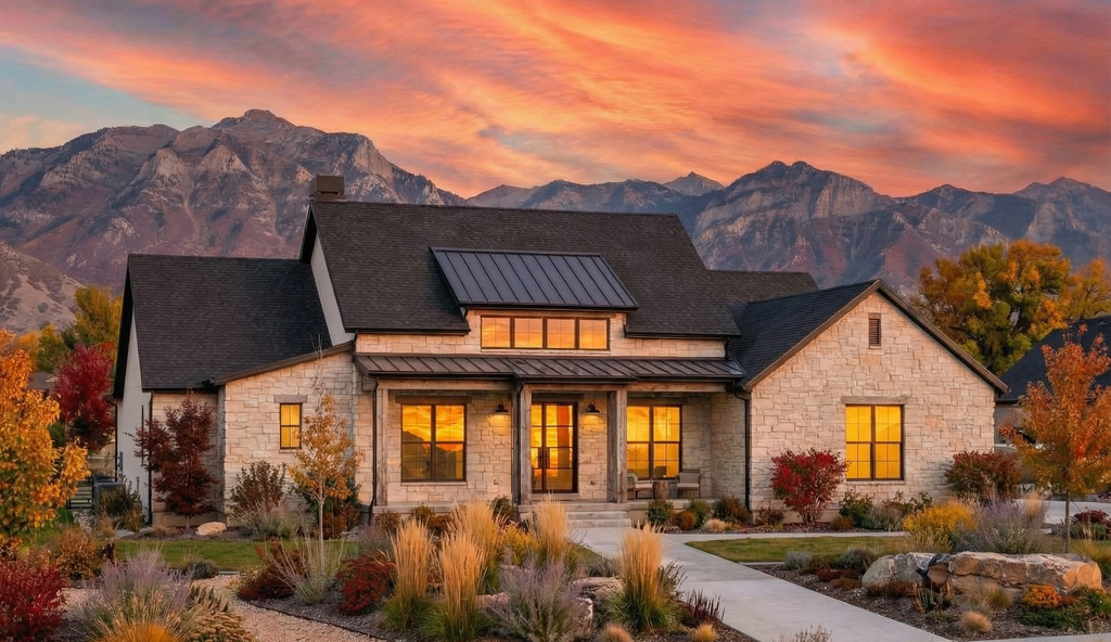 - Exterior Elevations: All elevations are noted, and an aerial view of the roof is provided, showing all hips, valleys, and ridges.