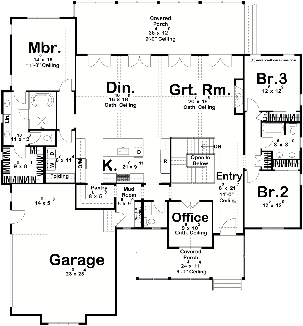 Ceiling Details : The rear and front covered porches have 9' ceilings. The entry has an 11' ceiling. The office has a cathedral ceiling. The great room and dining room have a cathedral ceiling. The master bedroom has a tray ceiling.