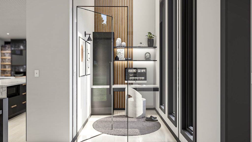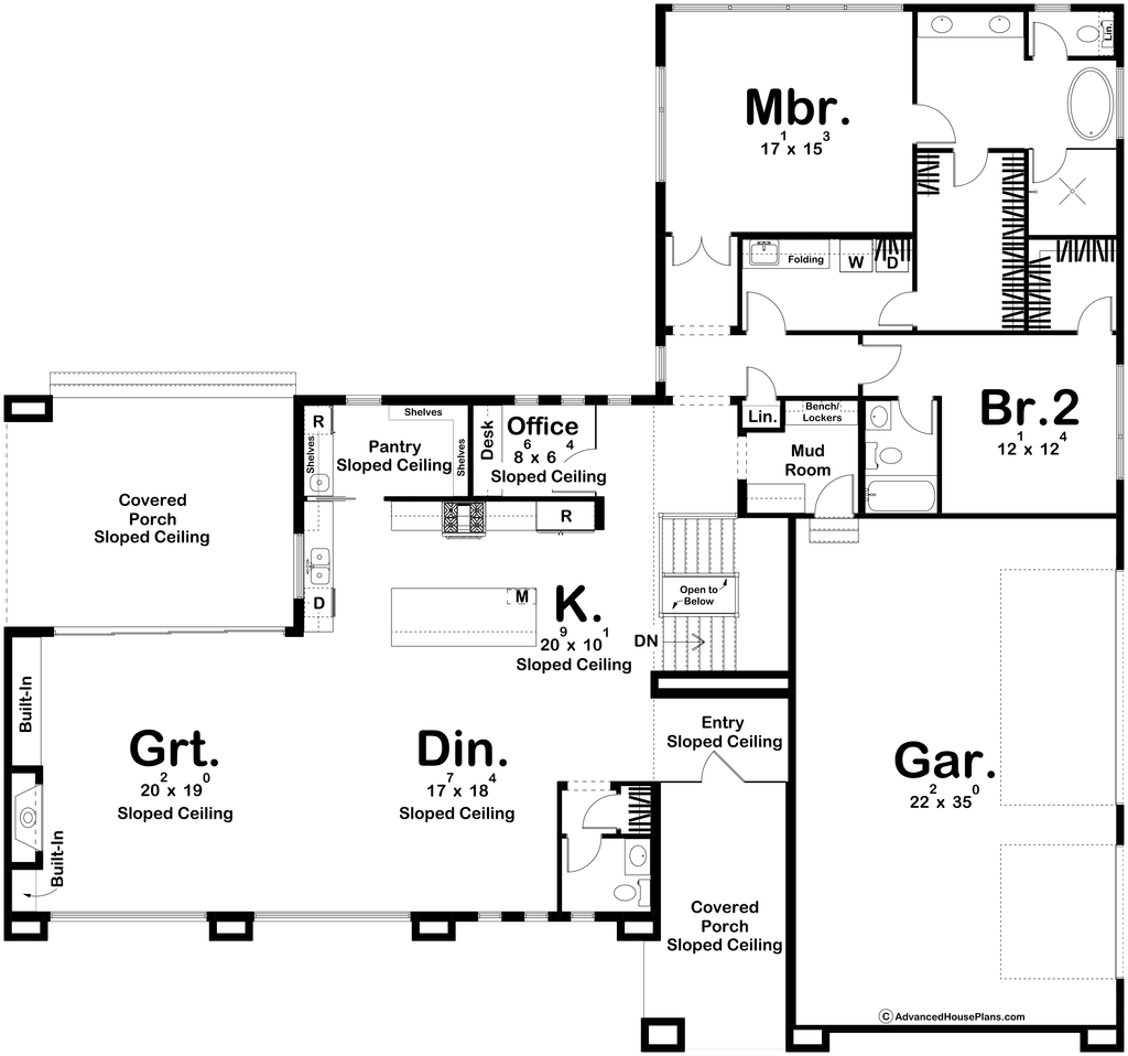 Ceiling Details : The front and rear covered porch, entry, kitchen, dining room, great room, pantry, and office all feature sloped ceilings.