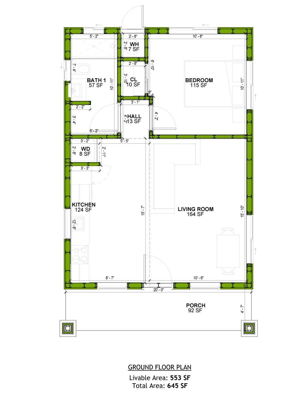 - Foundation Plan: This page shows all necessary notations and dimensions including support columns, walls, and excavated/unexcavated areas.