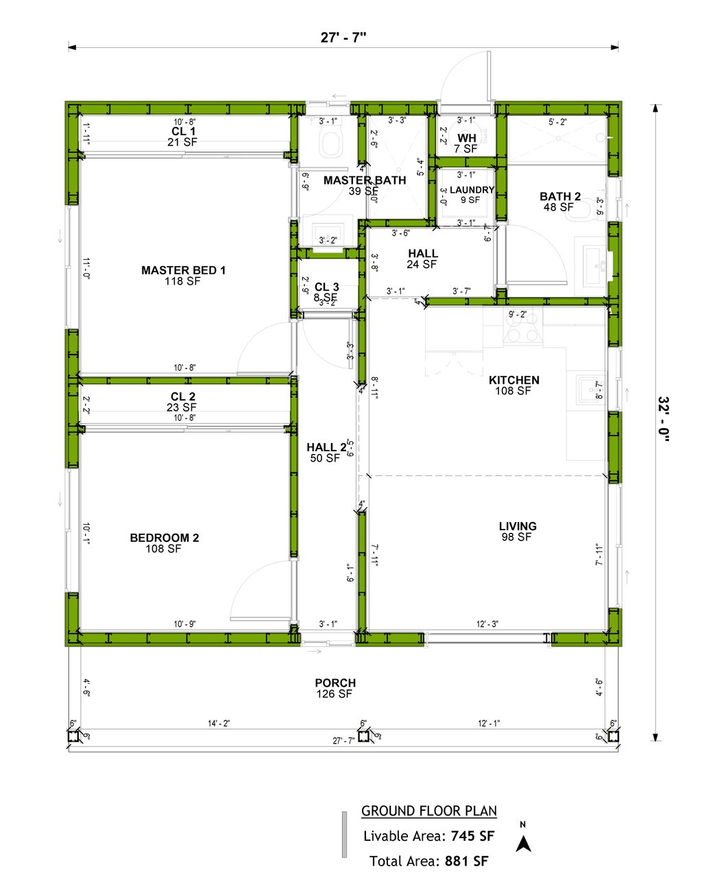 - Foundation Plan: This page shows all necessary notations and dimensions including support columns, walls, and excavated/unexcavated areas.