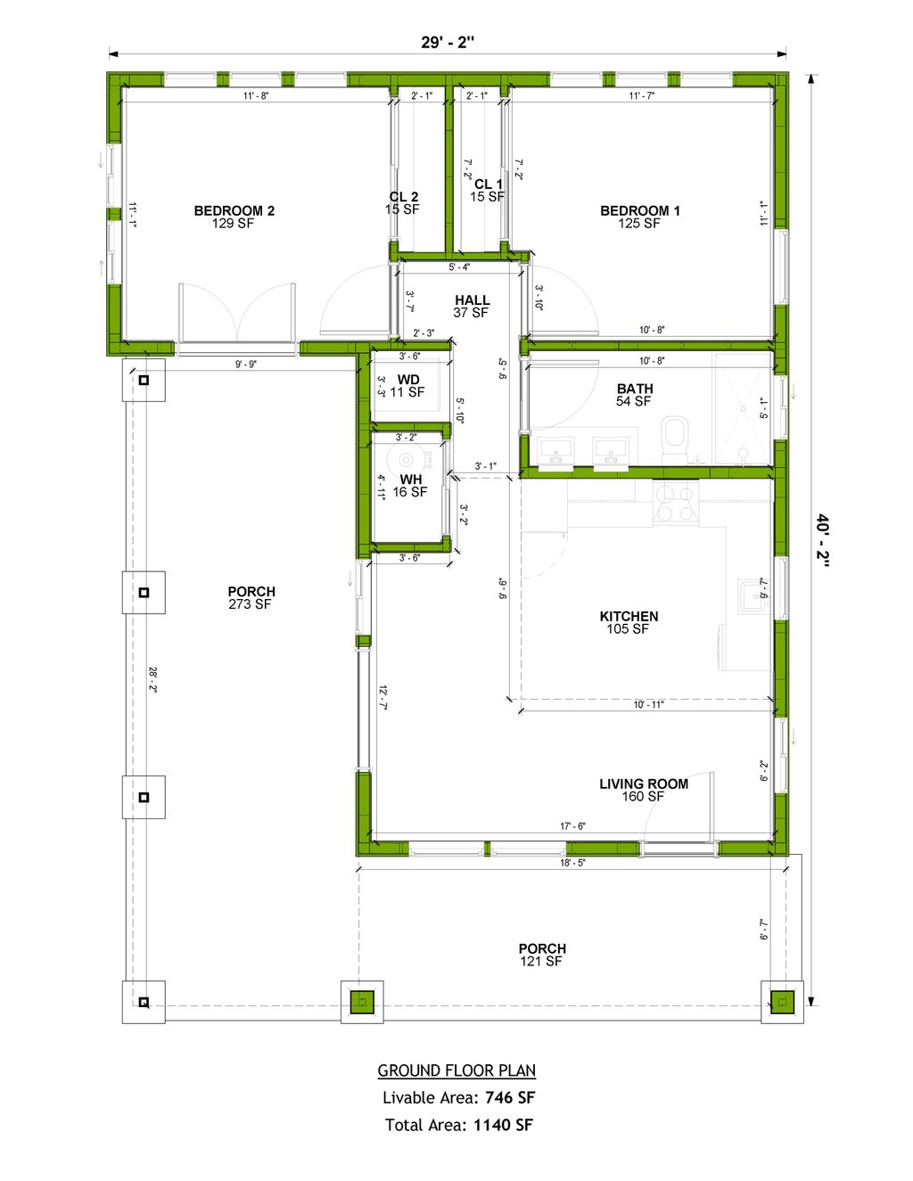 - Foundation Plan: This page shows all necessary notations and dimensions including support columns, walls, and excavated/unexcavated areas.