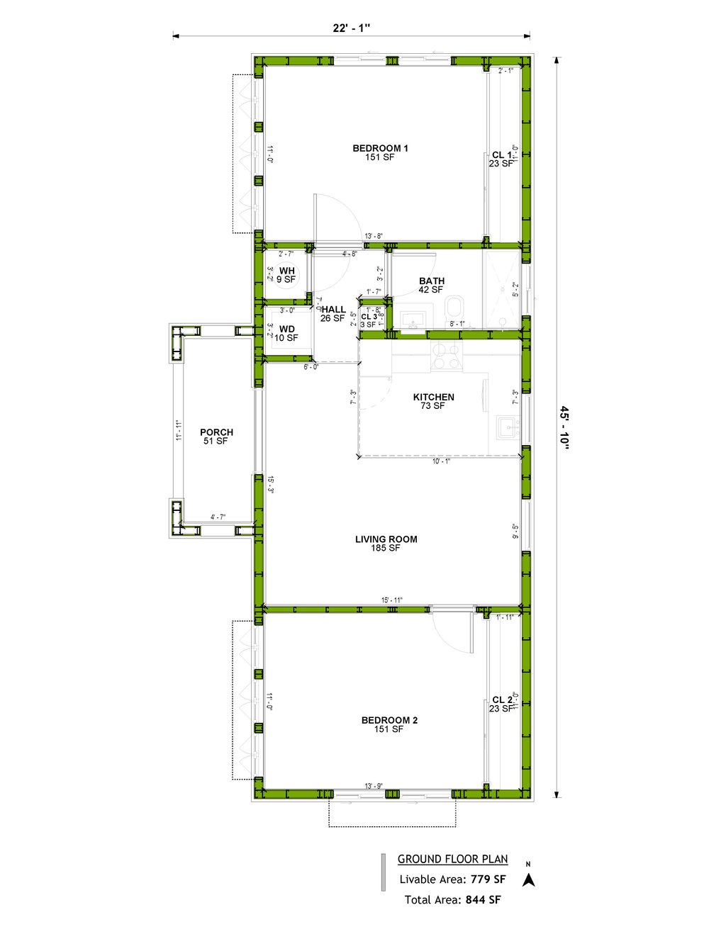 - Foundation Plan: This page shows all necessary notations and dimensions including support columns, walls, and excavated/unexcavated areas.