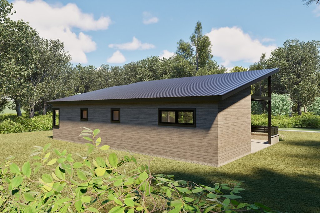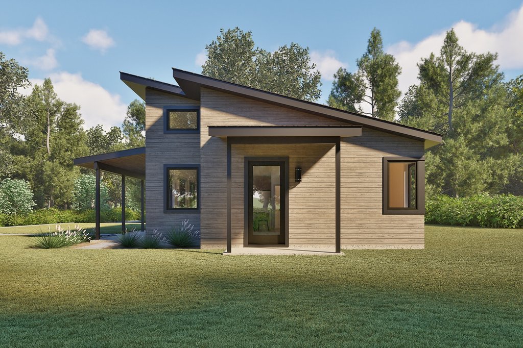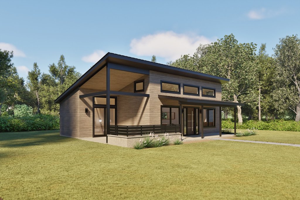 - Exterior Elevations: Views of the home from all four sides showing exterior materials, roof slope, ridge heights, siding and trim notes.
