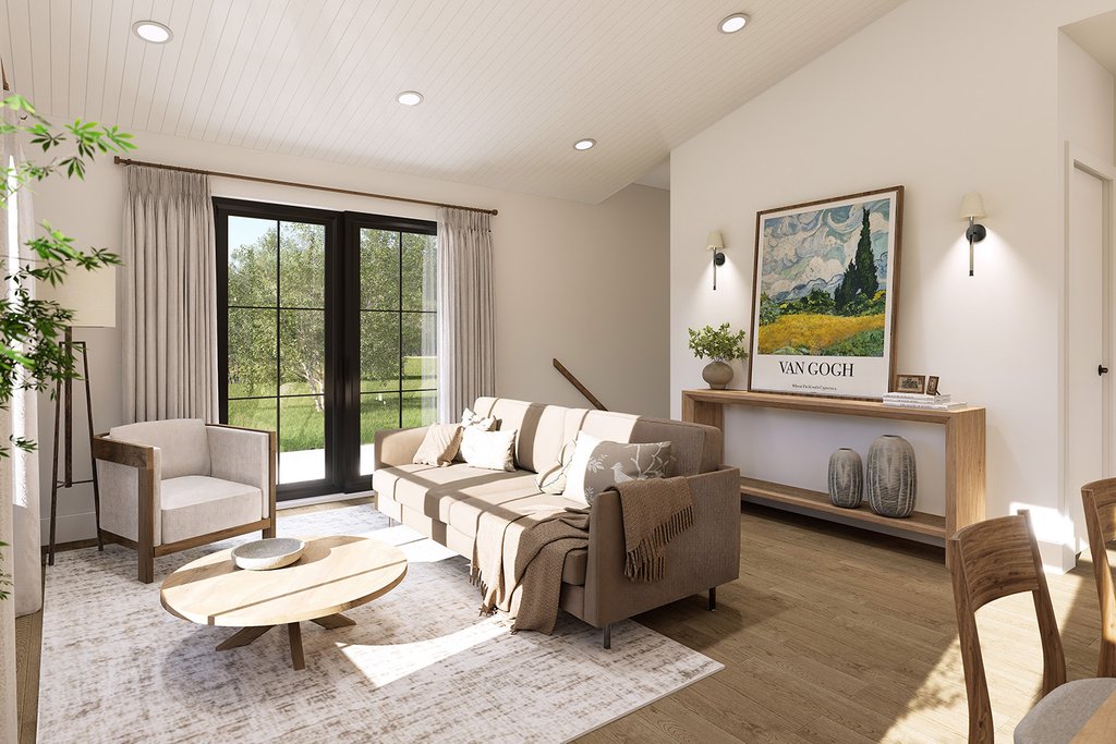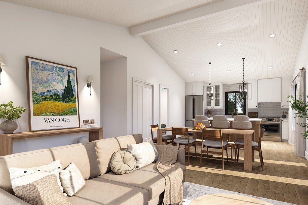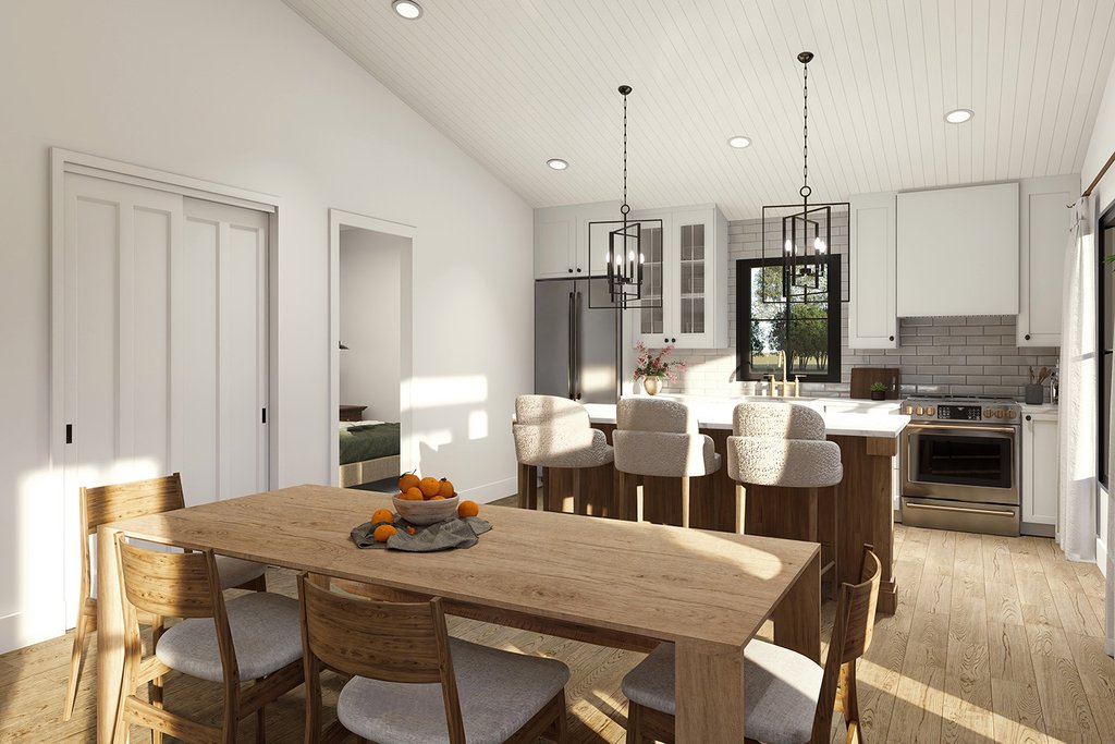 Ceiling Details : Main living area (kitchen, dining and living room) in cathedral ceiling.